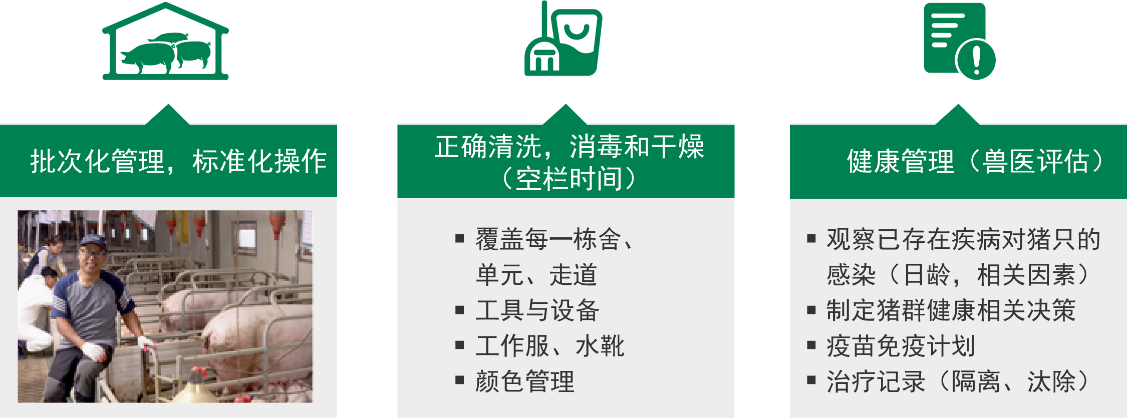 广泛的定义中,包含提高动物健康水平的所有工作理论上都属于内部生物安全的范畴。比如批次化管理,标准化的作业流程,科学的管理方式等,能够有效帮助减少疾病的发生,从而提高生产成绩。