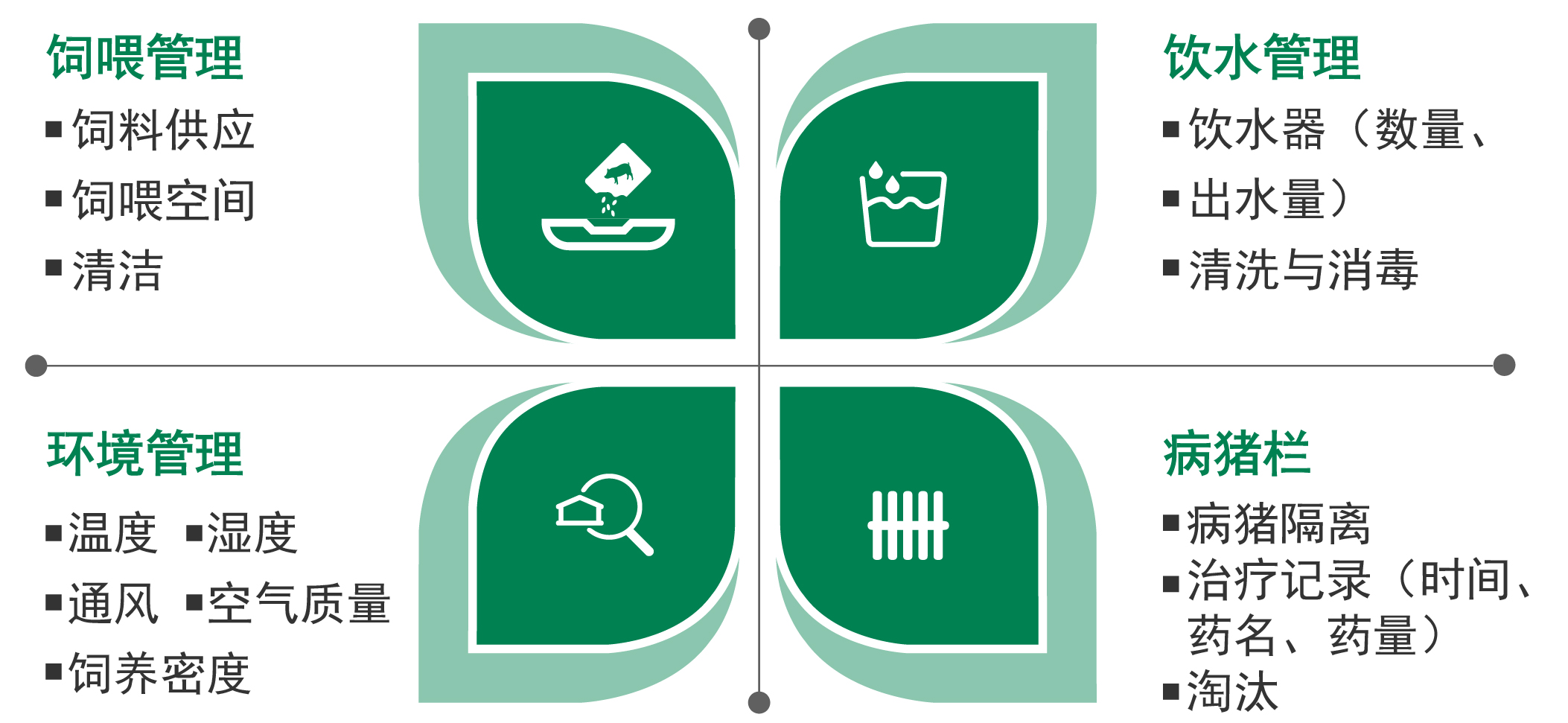 畜舍内环境管理,主要关注饲喂管理,饮水管理,环境管理和病猪栏。