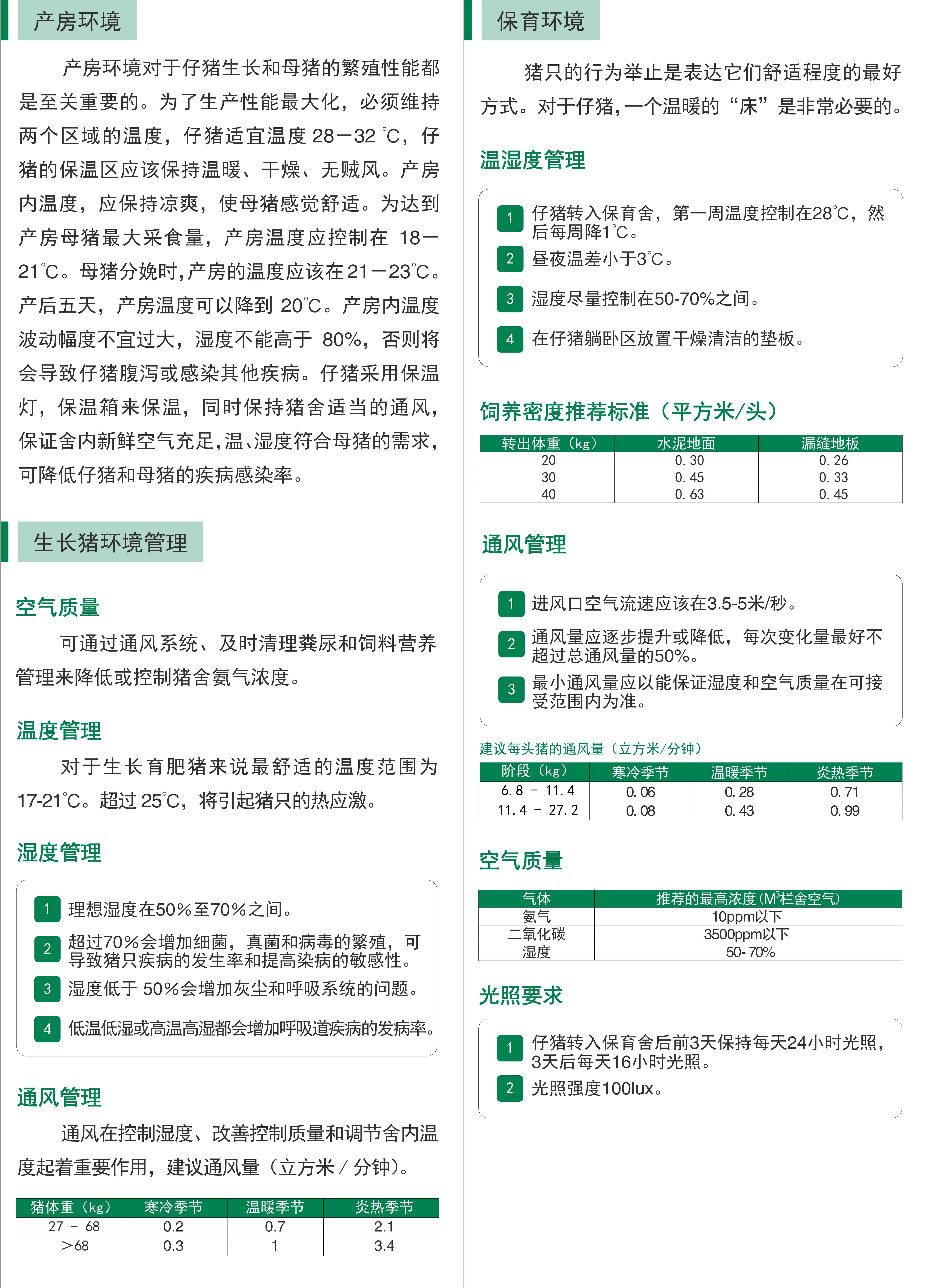 产房、保育、和生长猪等的对温度,湿度,通风,空气质量和饲养管理的要求都不尽相同,需要根据不同的生长阶段设定相应的标准。
